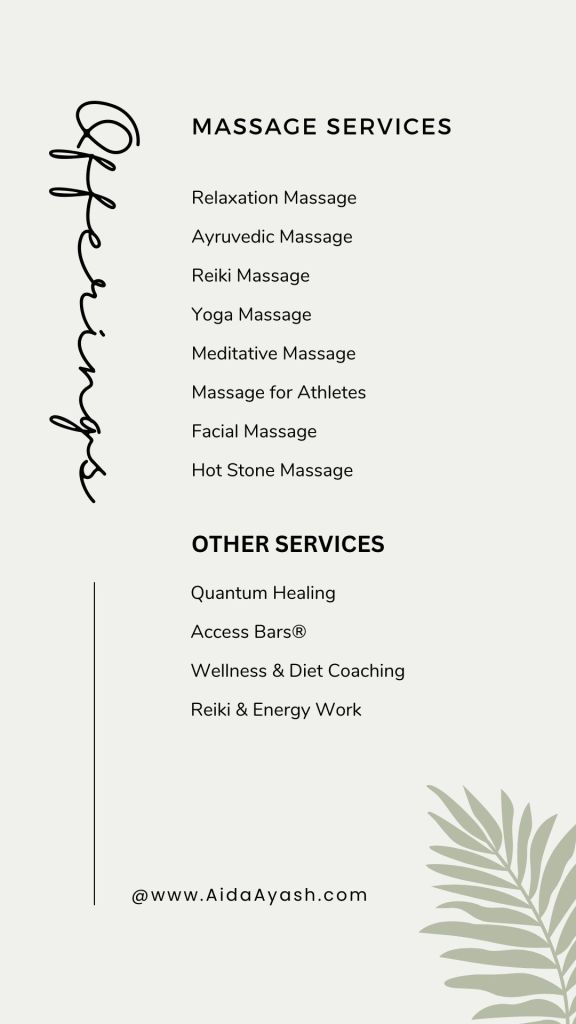 I am Aida Ayash, I am A Soul Awareness Healer, Massage Therapist, Access Bars Consciousness ® Practitioner & Facilitator, Reiki Master, Wellness & Diet Coach & a Quantum Healer.